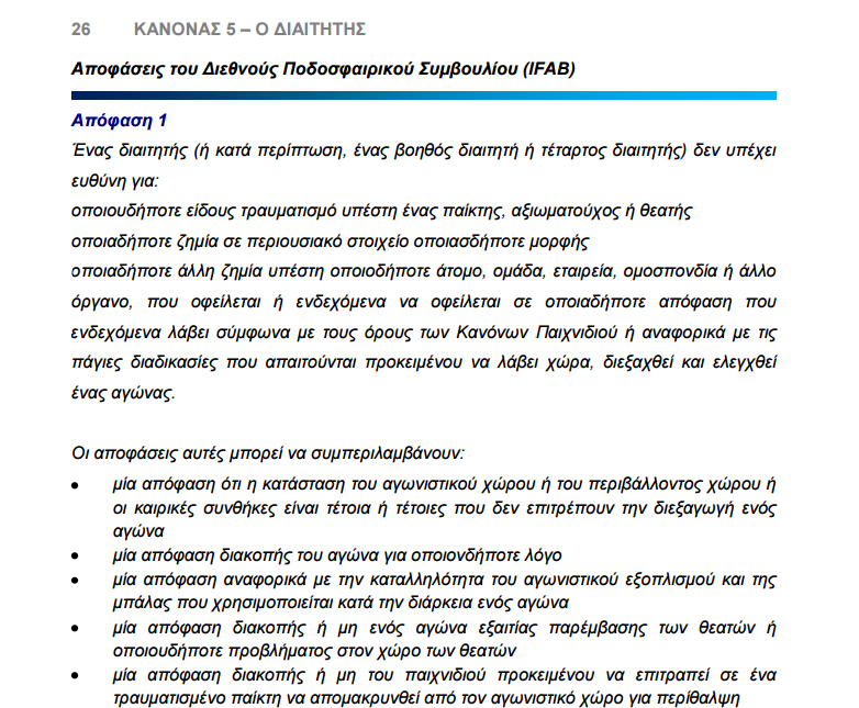 Επίσης είναι ξεκάθαρο στον κανονισμό της ΦΙΦΑ, που εφαρμόζεται σε όλα τα μέλη της, ότι διαιτητής δεν μπορεί να διωχθεί για γεγονότα που συνέβησαν κατά την άσκηση των καθηκόντων του εντός αγωνιστικού χώρου. Δείτε το σχετικό άρθρο: