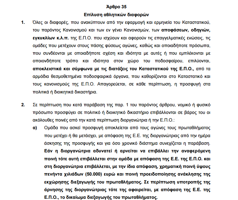 Οι πράσινοι κινδυνεύουν με αποβολή από τιο πρωτάθλημα, εφόσον προσφύγουν στα πολιτικά δικαστήριο για αθλητικό θέμα, σύμφωνα με το άρθρο 35 του ΚΑΠ. Η αποβολή διαρκεί για όσο διαρκή η προσφυγή και η διοργανώτρια είναι υποχρεωμένη να την εφαρμόσει.